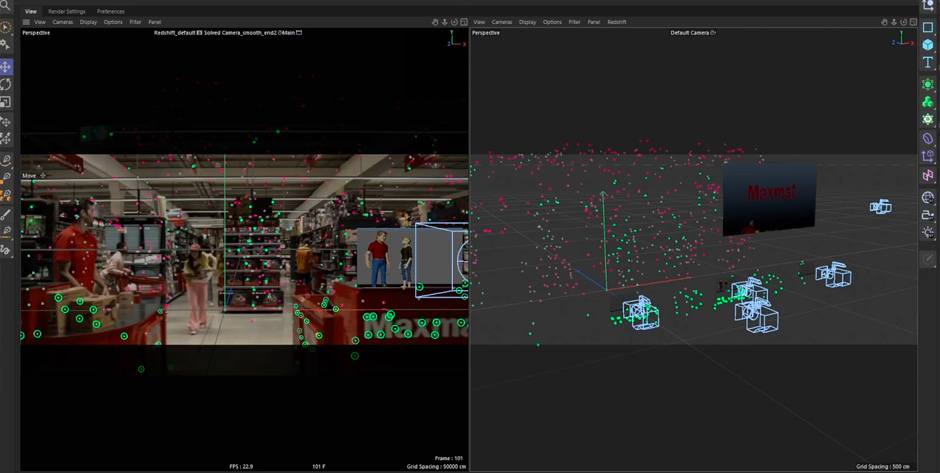 To make the VFX blend seamlessly with the live-action, we first 3D-tracked every shot. From there, we built a simplified 3D mesh of each scene, allowing us to model elements that worked as shadow catchers—or even replace entire storefronts when needed. Once the stage was set, we brought Max and Mat back in, animated their moves, and lit them to match the real footage perfectly.